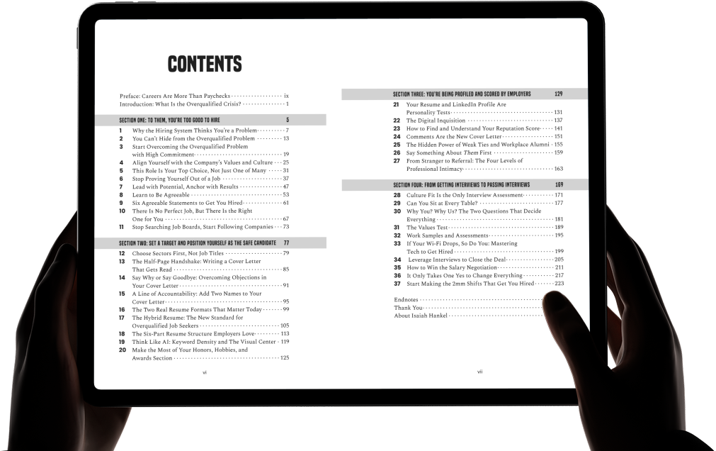 Overqualified candidates are more likely to be hired over other applicants, if and only if they make it clear that the role in front of them isn’t just acceptable, it’s preferred.